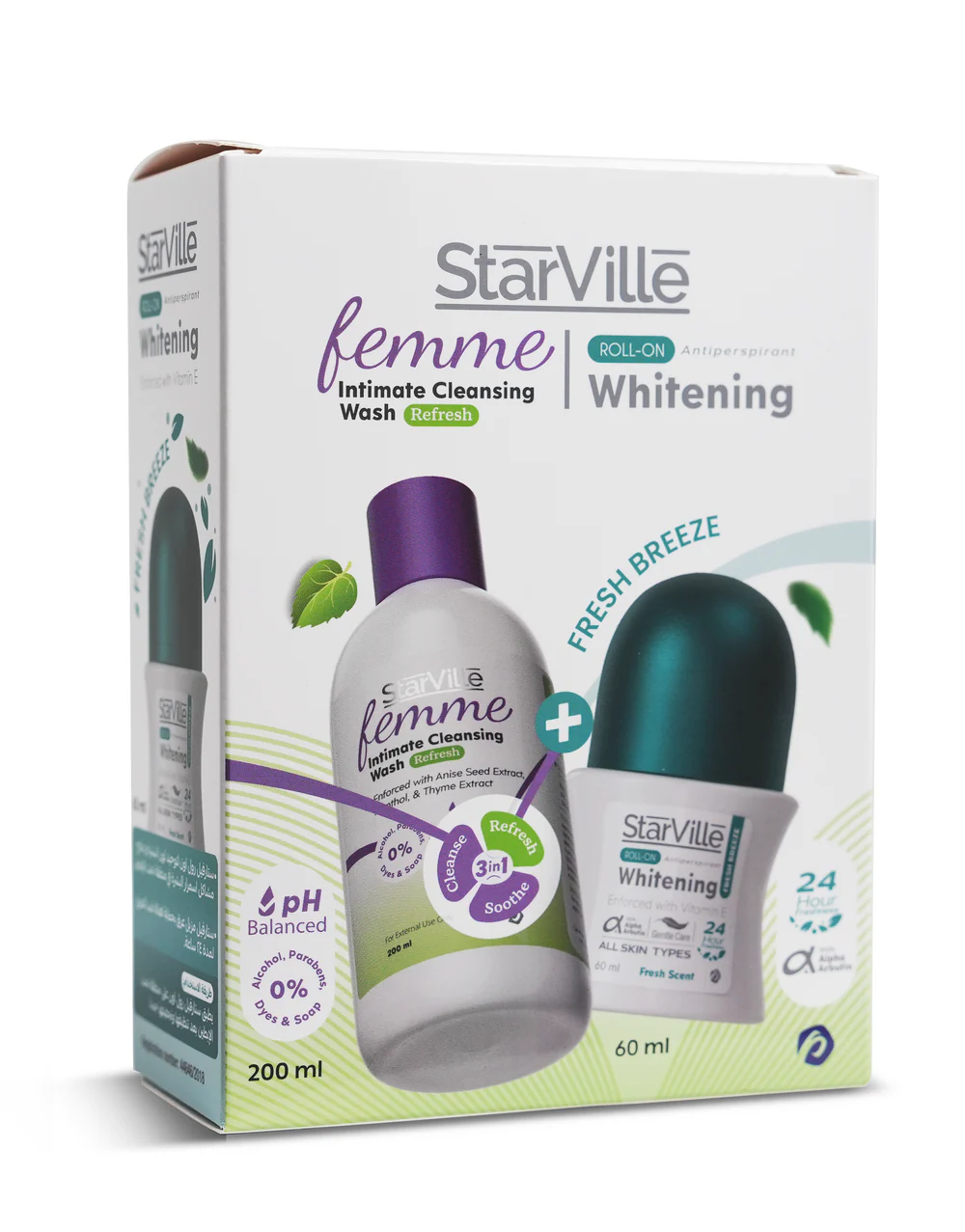 StarVille Femme Wash Refresh: Chamomile extract, Thyme extract, Menthol, Anise seed extract, Aloevera and lactic acid StarVille Roll- On fresh breeze: Rich in alpha arbutin, licorice extract, kojic acid, vitamin C, vitamin E, glycerin, lavender oil, panthenol, and aluminum salts free.